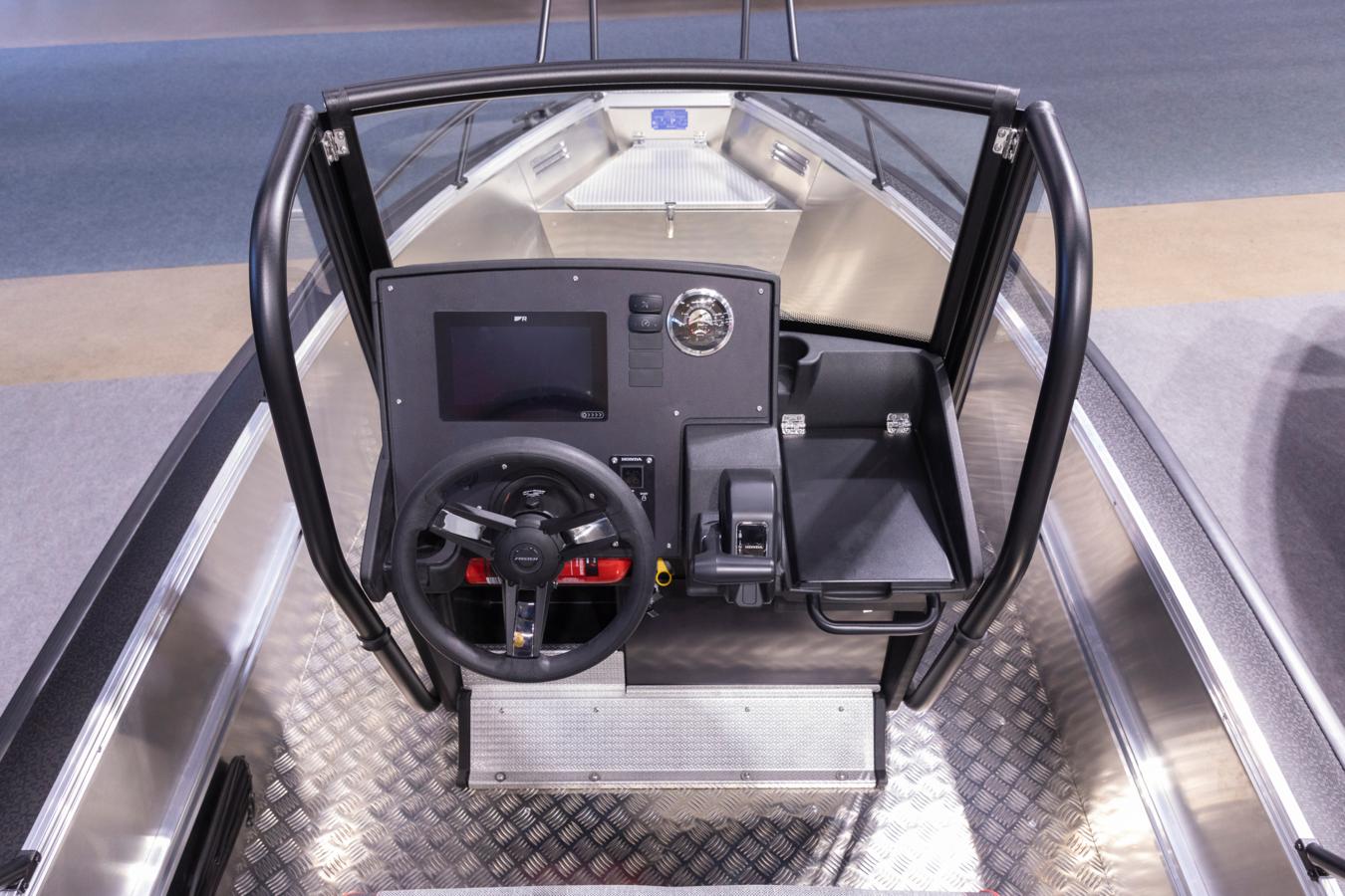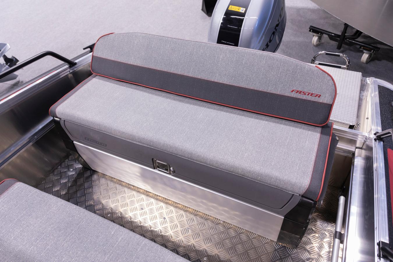 On the front side of the steering console are integrated steps that are familiar from Faster’s larger models. The steps make boarding over the side easier. Storage has been increased throughout the boat – there is a very spacious compartment under the driver’s Swing seat, a storage compartment for personal belongings in the console, and generous space under the stern bench for equipment and other essentials.