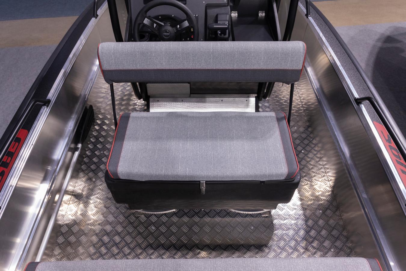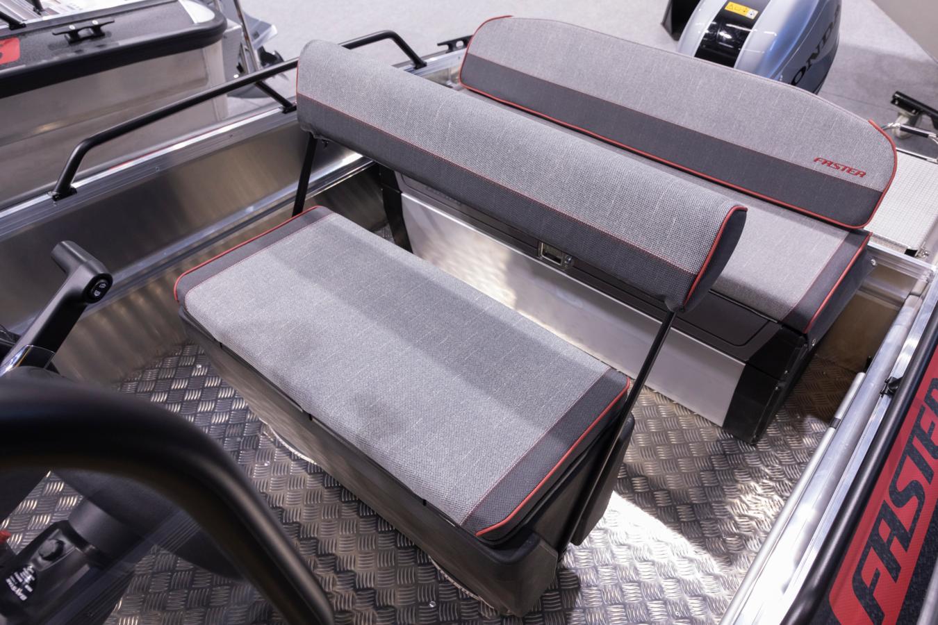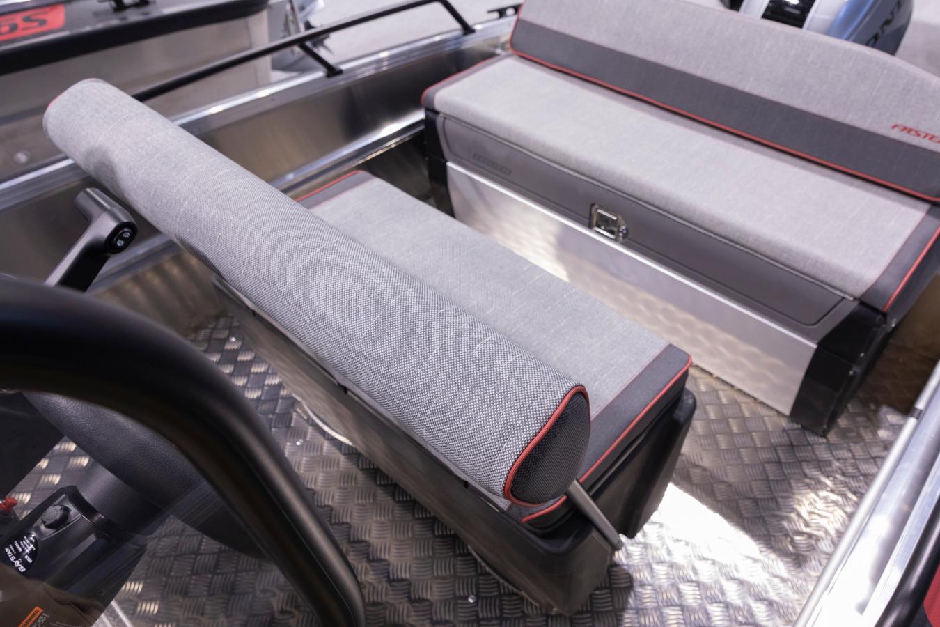 The practical side doors on either side of the wide centre console, together with the high windshield, provide excellent wind protection for all passengers, ensuring a comfortable boating experience. Behind the windshield, passengers enjoy comfortable seating – the driver and co-driver sit on a wide Swing seat box with foldable backrest, while other passengers travel on the wide rear bench. The standard equipment includes a 125 cm seat box with generous storage inside, that is places as stern bench. The seat box comes equipped with a slim Abloy lock, insulating Smart Deck surface, and a robust gas spring. Additional seating can easily be added using extra seat boxes or flip-up benches. Faster’s practical accessory rails make installing add-ons quick and effortless.