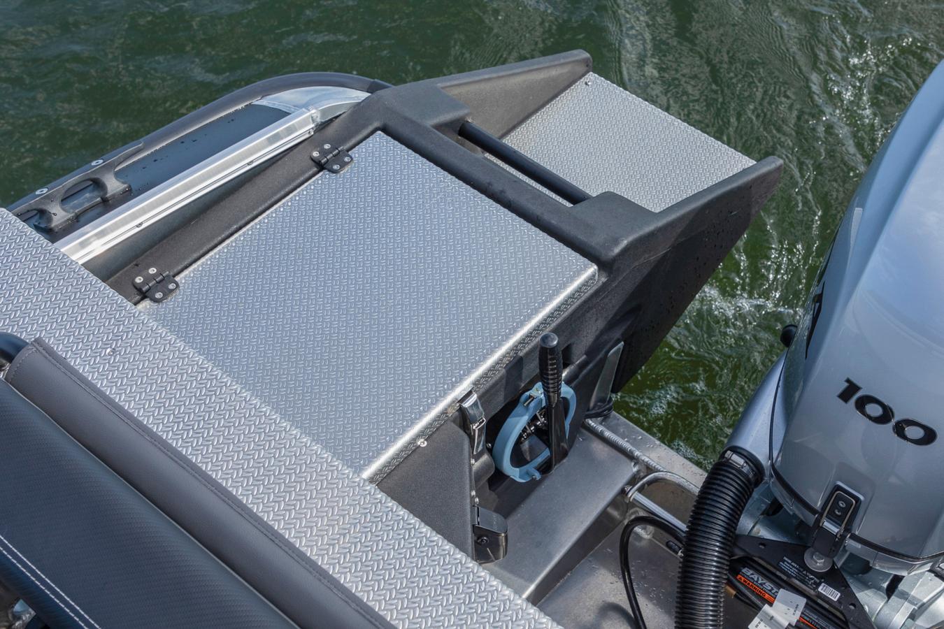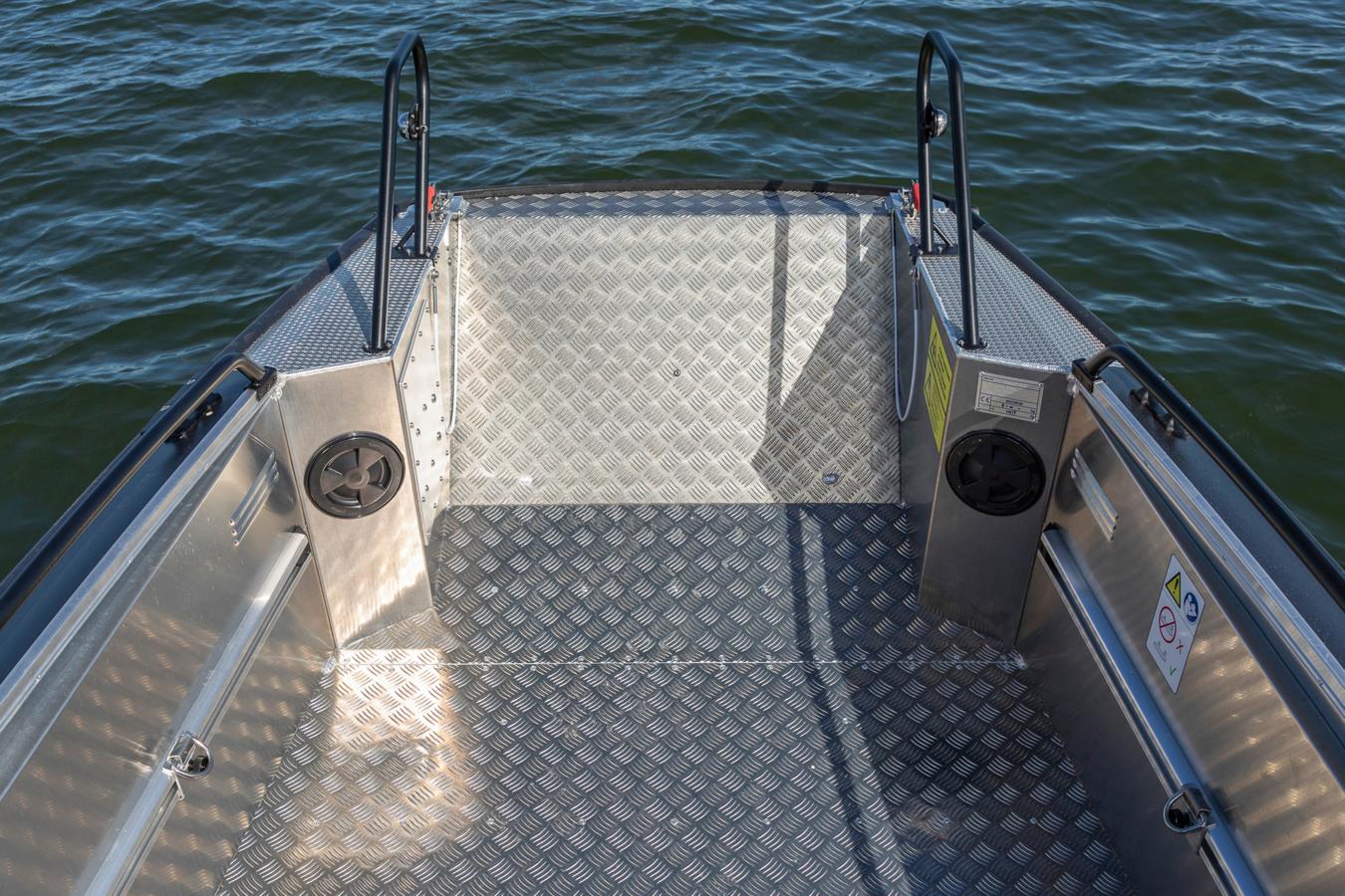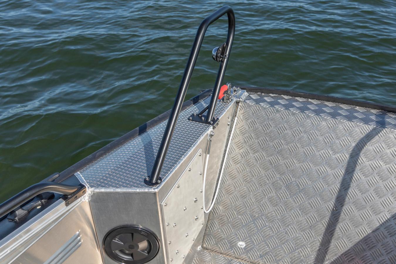 Despite its large bow ramp, the 545 CC delivers the familiar high-quality handling that Faster boats are known for. The hull is carefully designed so that the bow ramp doesn’t touches the water surface while underway, ensuring smooth, balanced, and predictable performance even in rough conditions. Its excellent weight distribution and hull design guarantee safe handling even when fully loaded. Cargo can be secured quickly and efficiently using optional lashing points along the modular equipment rails.