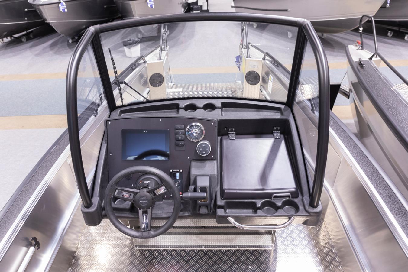 The open deck layout surrounding the central console allows safe and easy movement on board. The extremely durable, patterned aluminium flooring ensures good grip even in wet conditions, while sturdy side rails provide secure handholds when needed. The central console features a high windscreen that protects passengers while maintaining excellent visibility. All controls, meters, and the standardly fitted Raymarine Axiom+ 9RV chartplotter are within easy reach of the driver at all times.