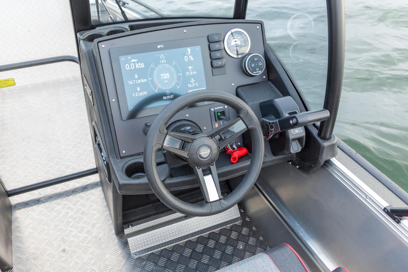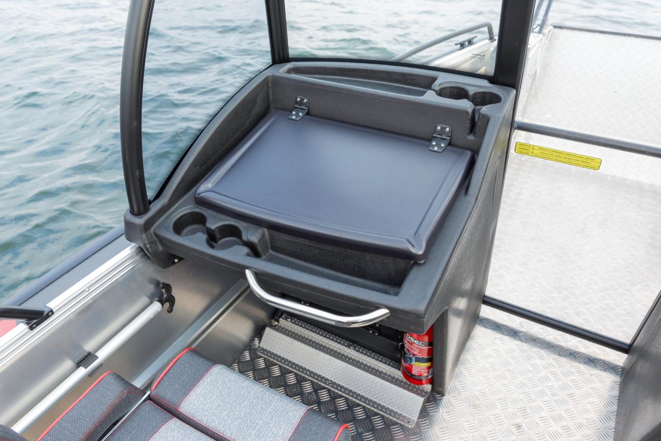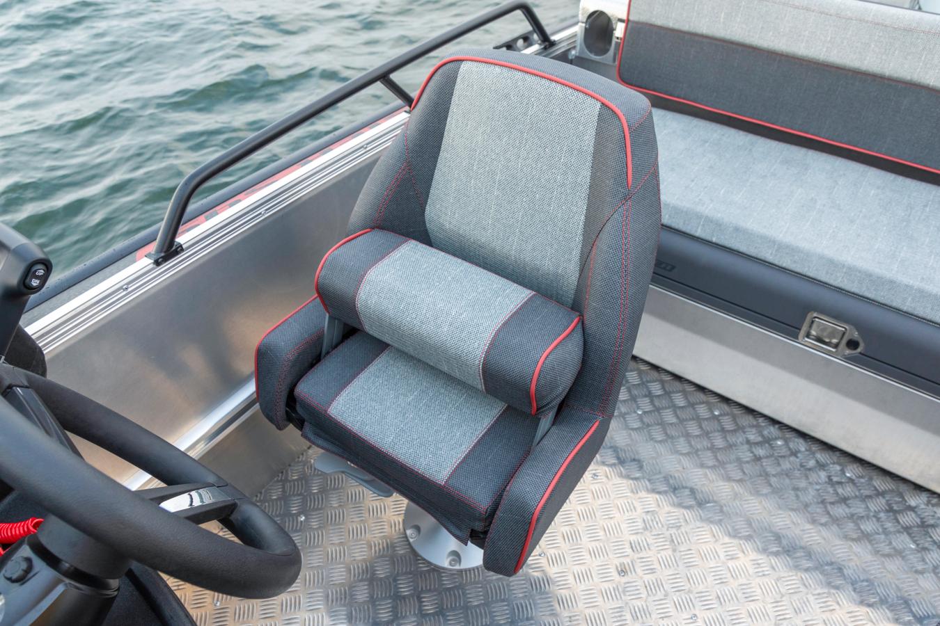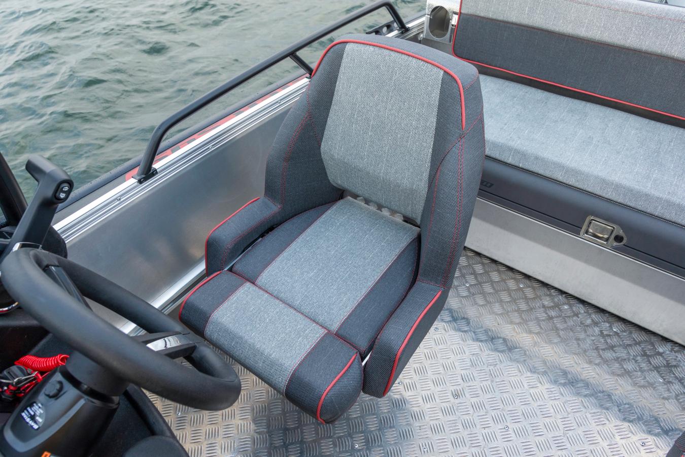 The standard seats for driver and co-pilot are adjustable and made of durable hard plastic, with the option to upgrade to fully padded comfort seats for enhanced comfort and support. Shock-absorbing seat pedestals are available for harsh and demanding sea conditions, helping to reduce strains on the back.