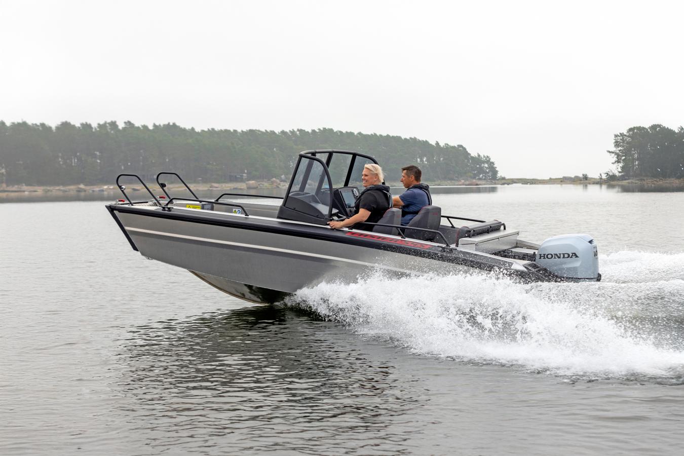 The Faster 545 SC is a robust and versatile pure aluminium dual console boat designed for family outings, fishing trips, diving excursions as well as passenger and cargo transport. Many also utilise the Faster 545 models for professional use. Its practical bow ramp make boarding, loading and unloading effortless – whether at rocky shores, docks or natural beaches – and sheltered passenger area makes the rides enjoyable for the whole crew. Built for active use in a wide range of conditions, this boat is made to perform reliably in all weathers, even year-round.