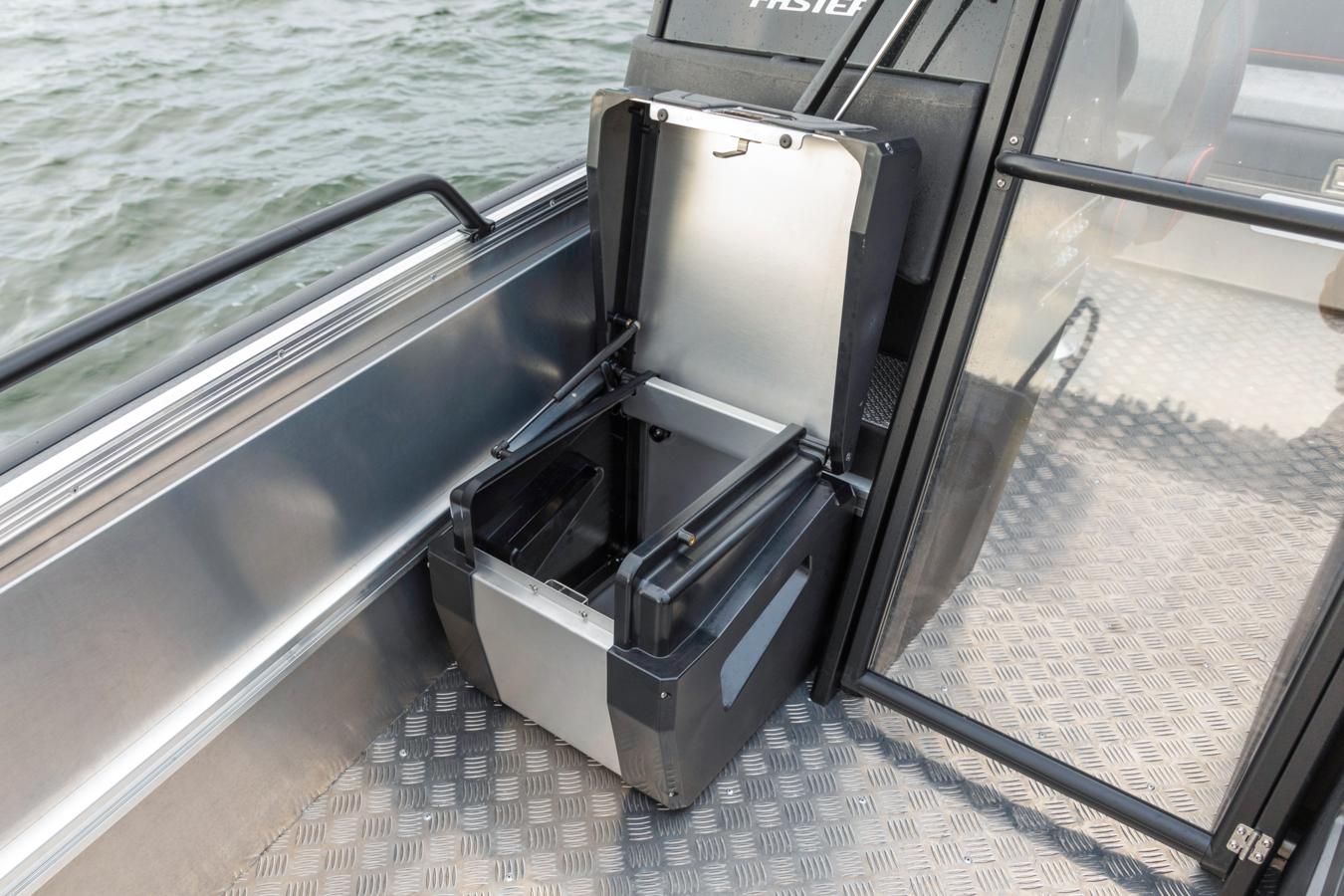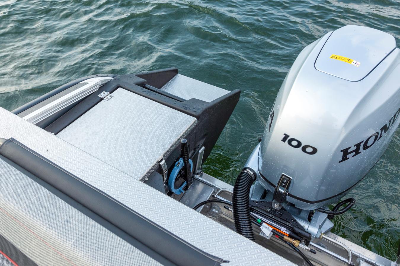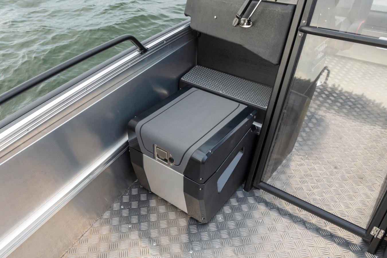 The removable 125 cm wide stern bench serves as both seating and storage. It is equipped with a quick drying SmartDeck surface coating for insulation and comfort, a slim Abloy lock mechanism, and a gas strut for easy access. The box can also be removed to open up the stern deck for fishing, cargo, or other activities.