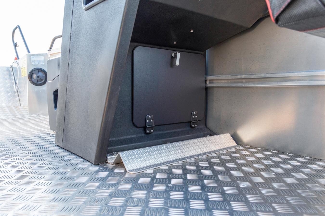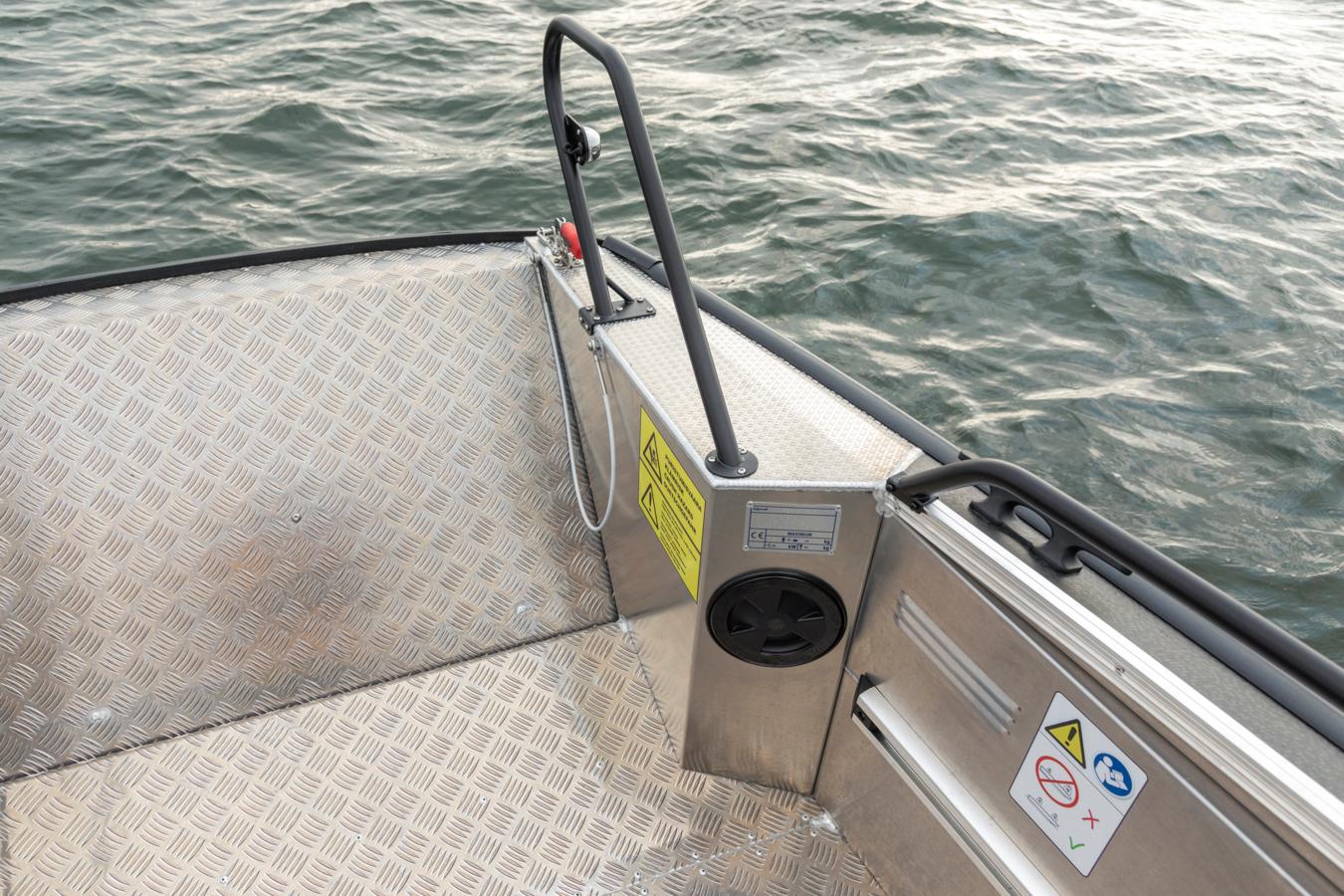 Operating the bow ramp couldn’t be easier: simply release the locks at the front of the bow ramp and control it via a switch on the steering console’s control panel. The ramp makes it easy to step ashore and embark anywhere – rocky beaches, low piers or natural harbors alike. The durable, well-crafted aluminium hull also ensures safe operation in shallow waters. Along the 87 cm wide bow ramp it is effortless to load on bikes, wheelbarrows, baby strollers, heavy gear and diving equipment, and is also perfect for safely bringing pets aboard. Bulky equipments are easy to secure in place with the help of lashing points that can be mounted onto the accessory rails (additional accessories) in desired locations along the interior hull sides.