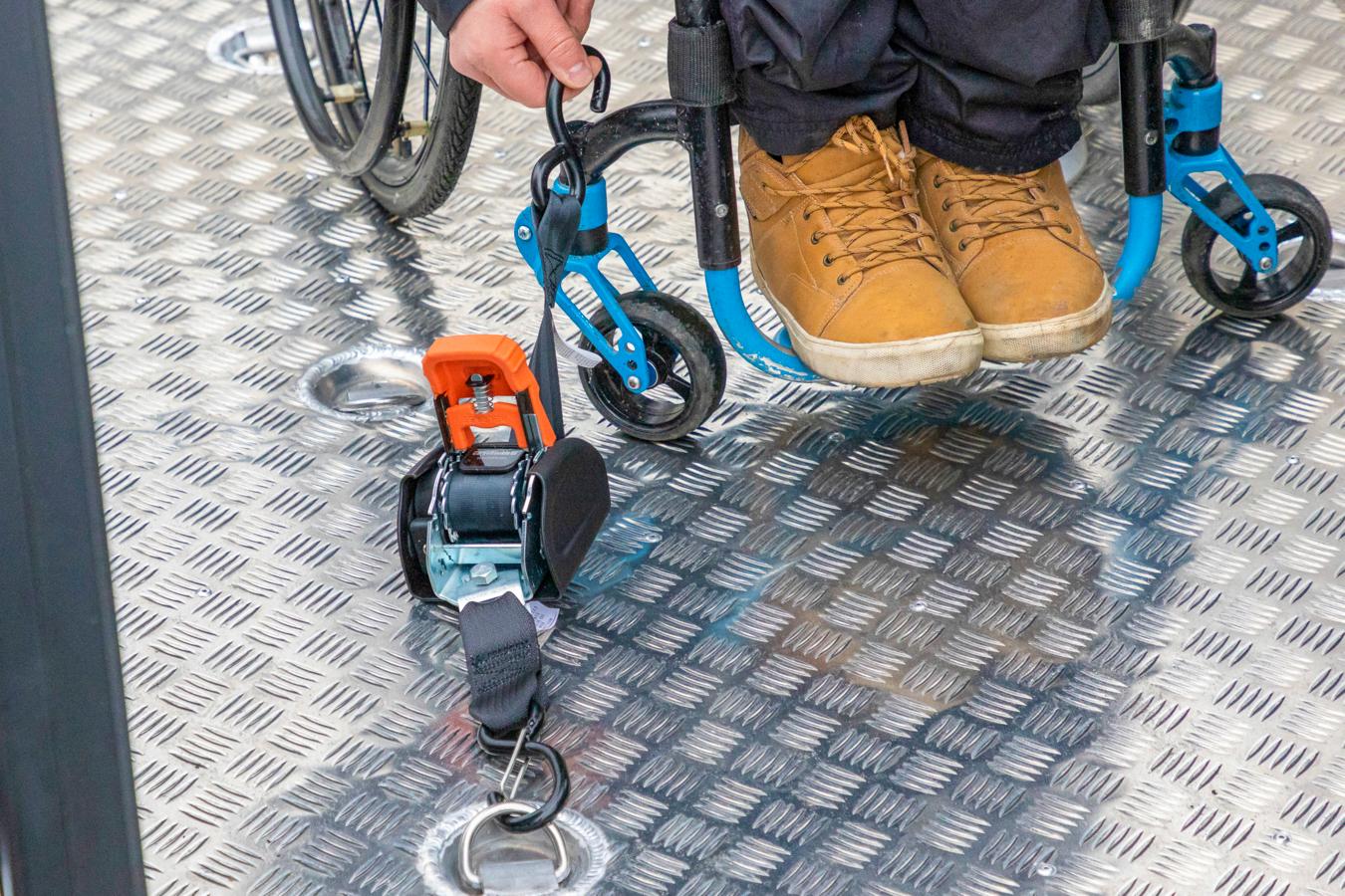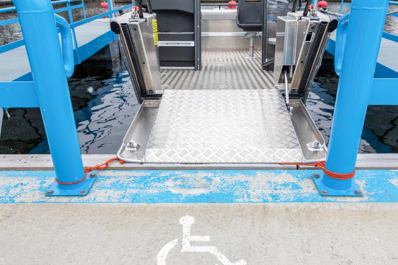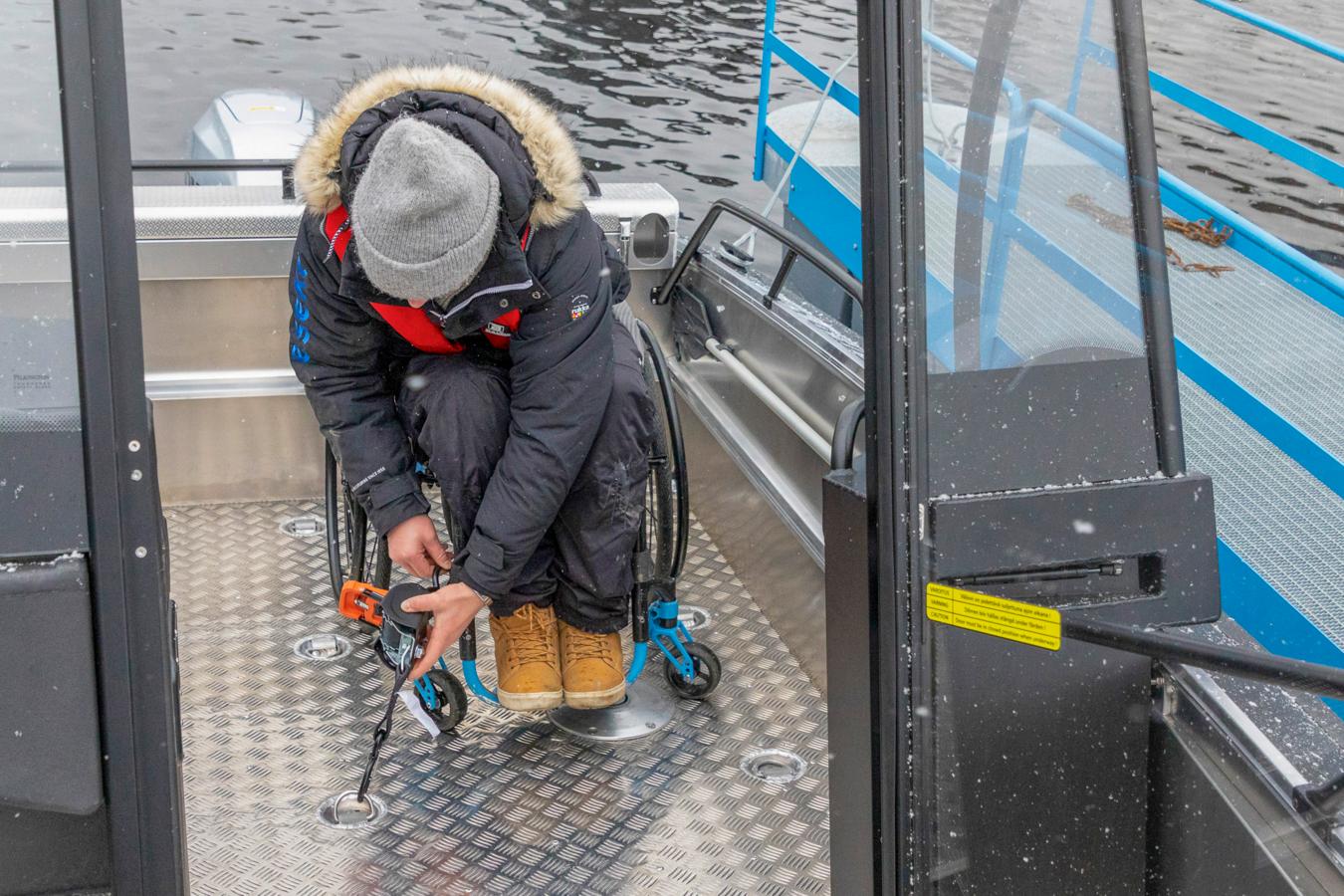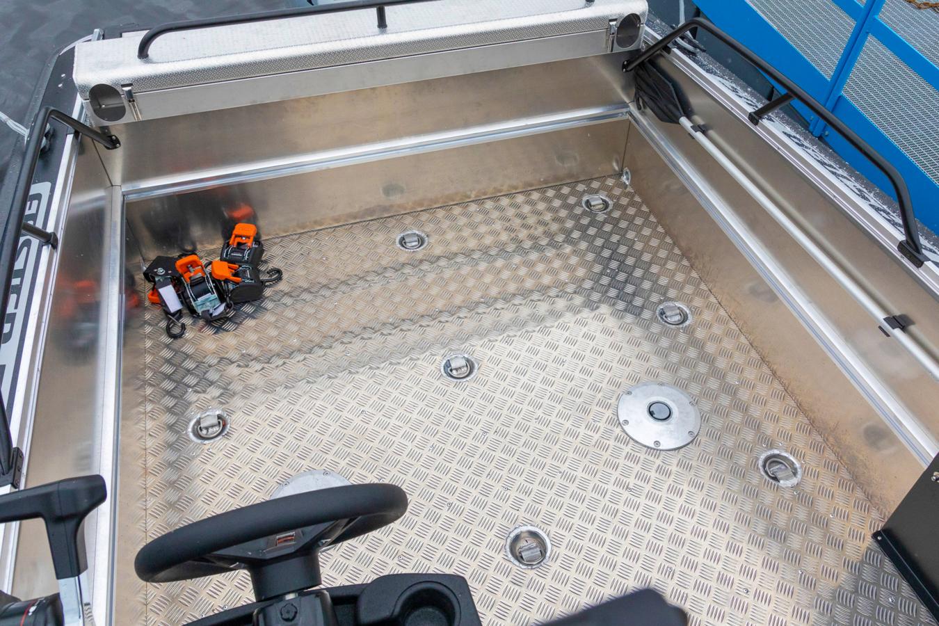 On the aluminum deck in both the bow and stern there are standardly fitted robust load securing loops, to which it is easy to tie down packing or bulky goods. The lashing rings can also be used to secure the wheelchair when driving in harsh conditions.