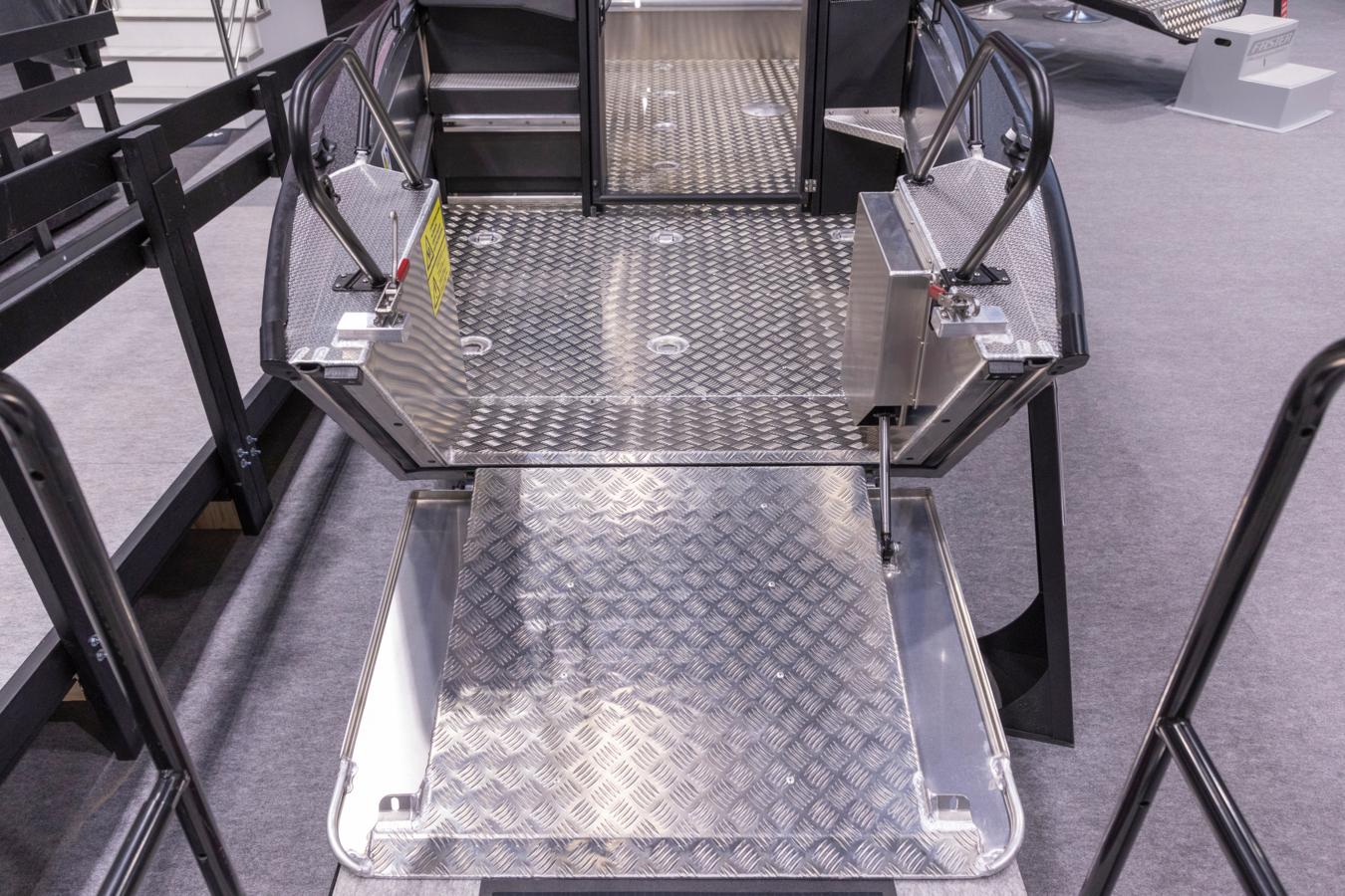 The hydraulically operated bow ramp, which for the 545 SCA model has been slightly redesigned to ensure best possible wheelchair accessibility, makes docking easy and embarking the boat effortless directly from the dock or beach along the boat’s own ramp. The ramp’s lower threshold facilitates boarding the boat, while the flat aluminum deck makes it easy to move around in and operate the boat, even from a wheelchair. The bow ramp is raised and lowered at the touch of a button on the dashboard or by the standardly included remote control.