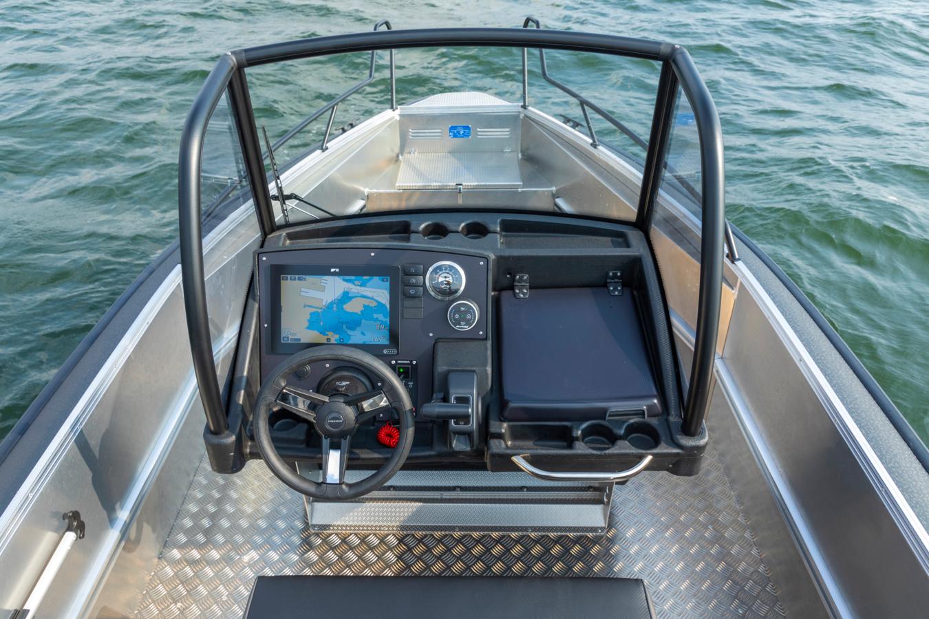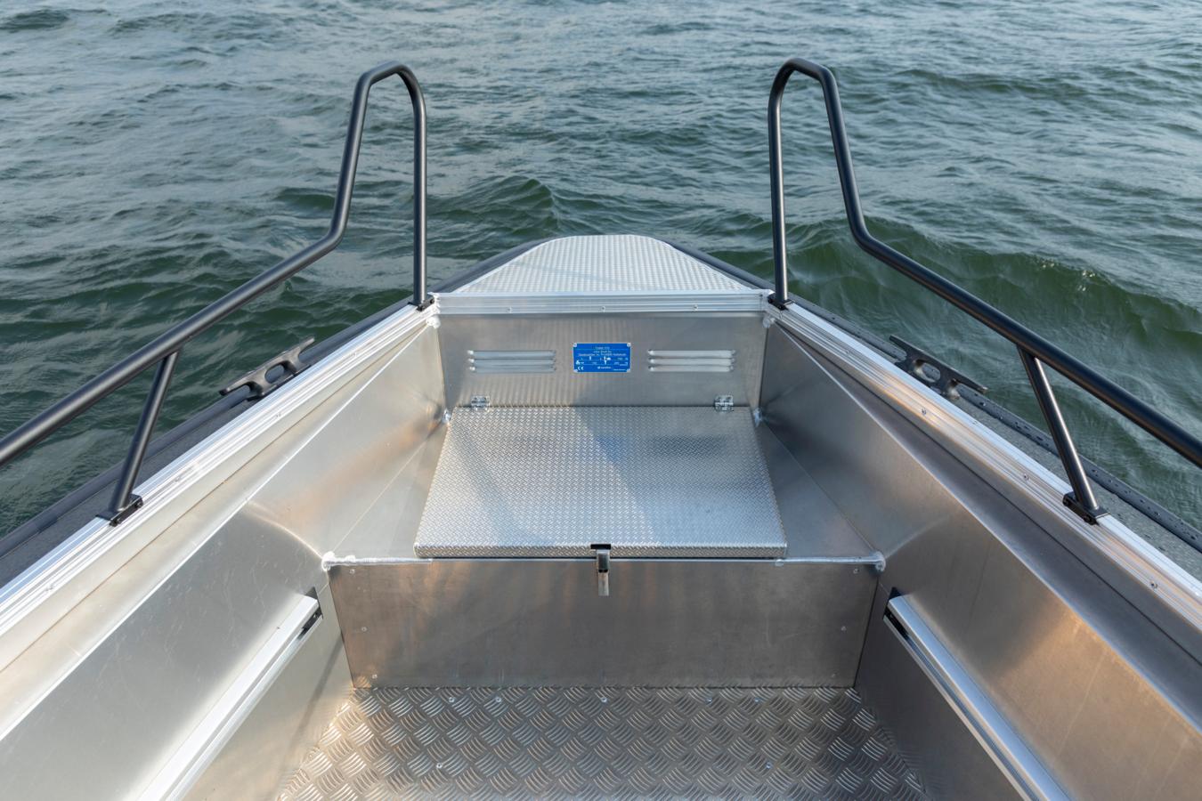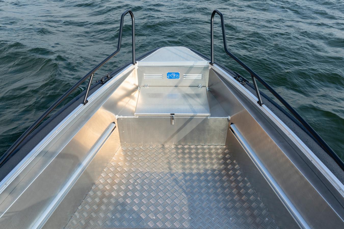 The open bow and wide walkways provide plenty of room for passengers and gear. Thanks to the spacious layout and the centrally placed steering console, moving around on board the boat is safe and easy. Plenty of open deck space ensures that you can utilize the space to the max, whether it be for load carrying, fishing or passenger transporting.