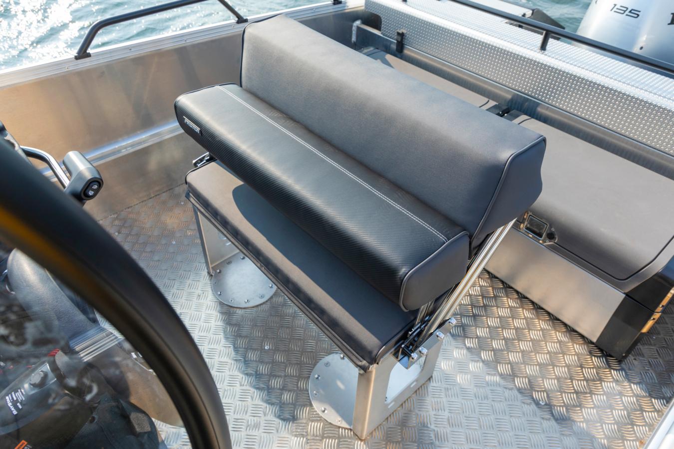 Faster 570 CC is designed to carry a maximum of 8 passengers, of which the driver and co-pilot sit by the steering console, and 3 adults can travel comfortably on the stern bench. Remaining passengers can be seated in the bow with the help of additional seat boxes or folding flap seats (additional accessories). The list of accessories available for this particular model can be found further down the page, in a separate tab next to the Technical Specifications table.