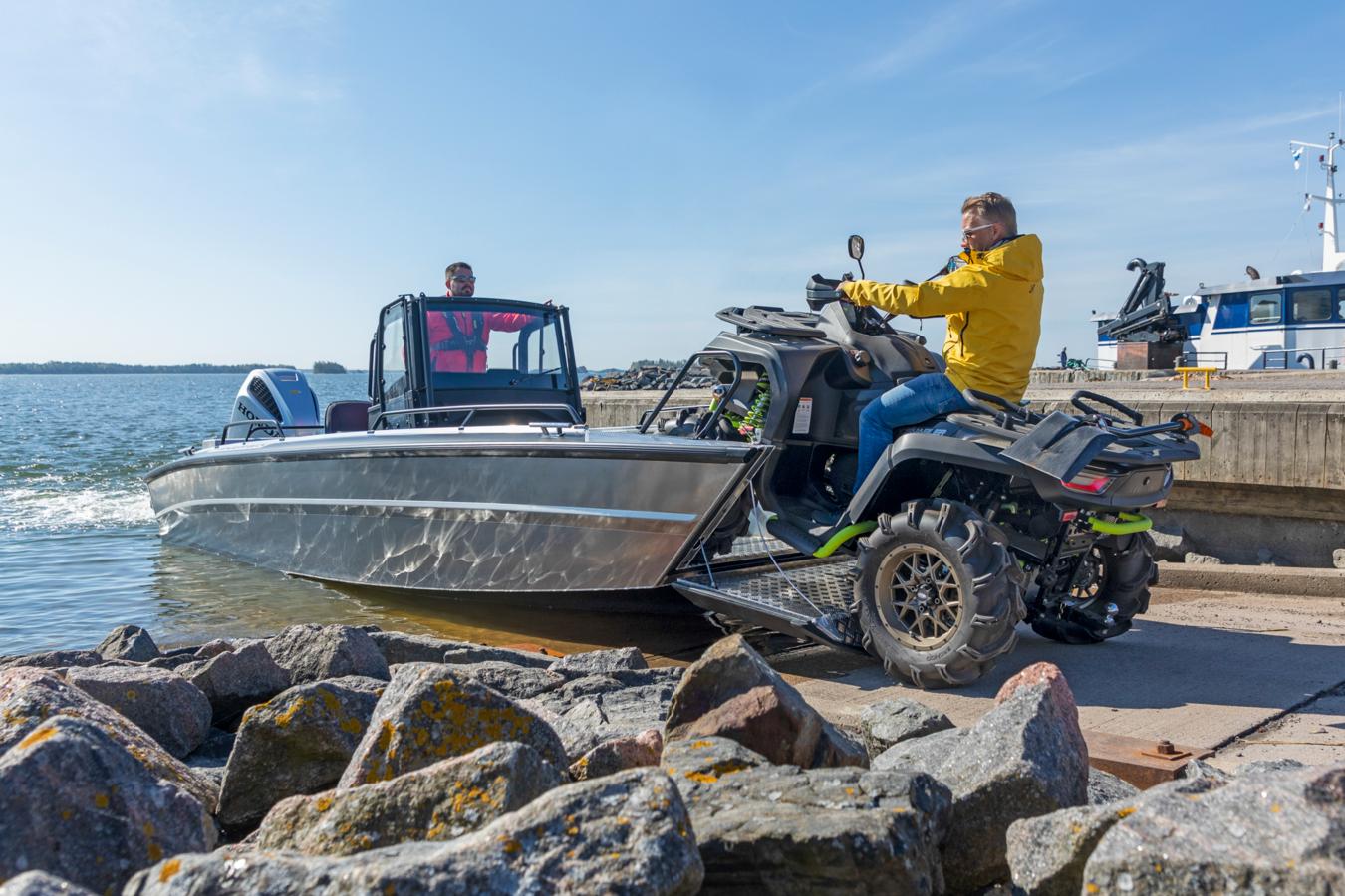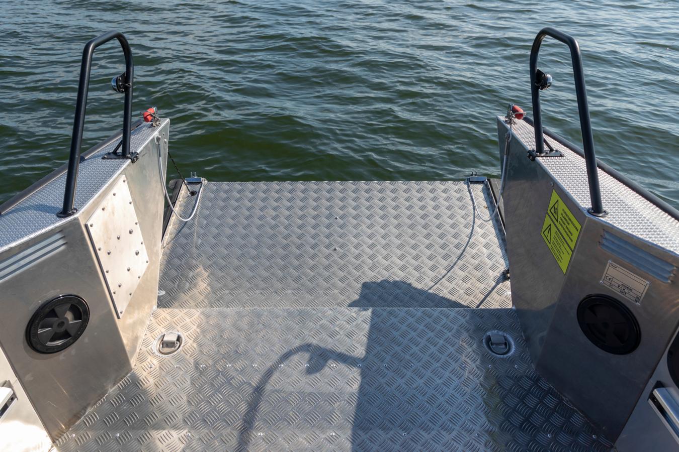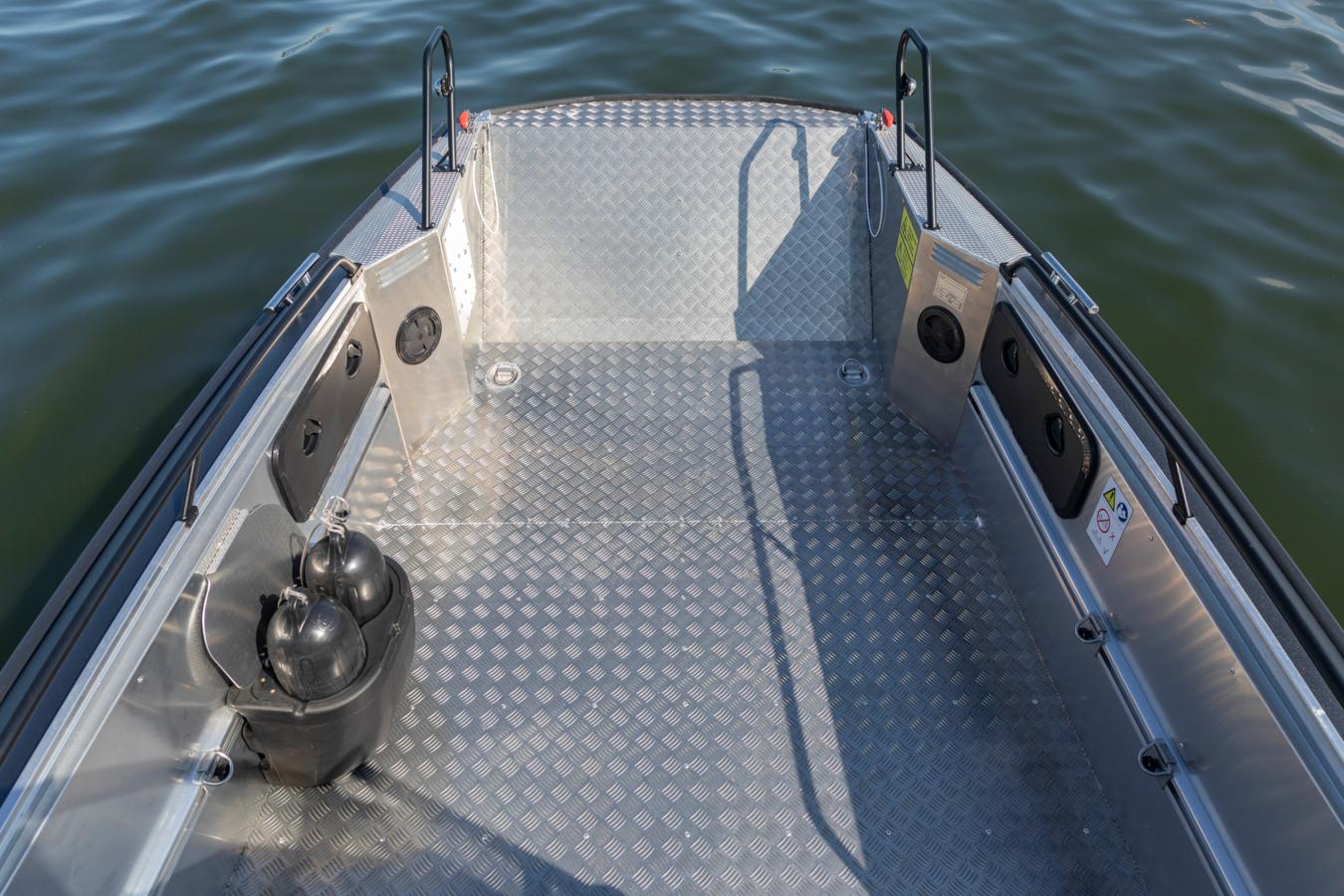 The whole construction of the boat, the practical bow ramp and the spacious bow area create a variety of different usage purposes for the boat: The easy-attainable deck space is optimal for transporting sizeable loads, for fishing or even for transporting diving equipment – with the bow ramp opened, divers can easily slide into the water from the bow. The 1,27 m wide practical bow ramp facilitates loading and embarkation, and even enables easy transportation of an ATV.
