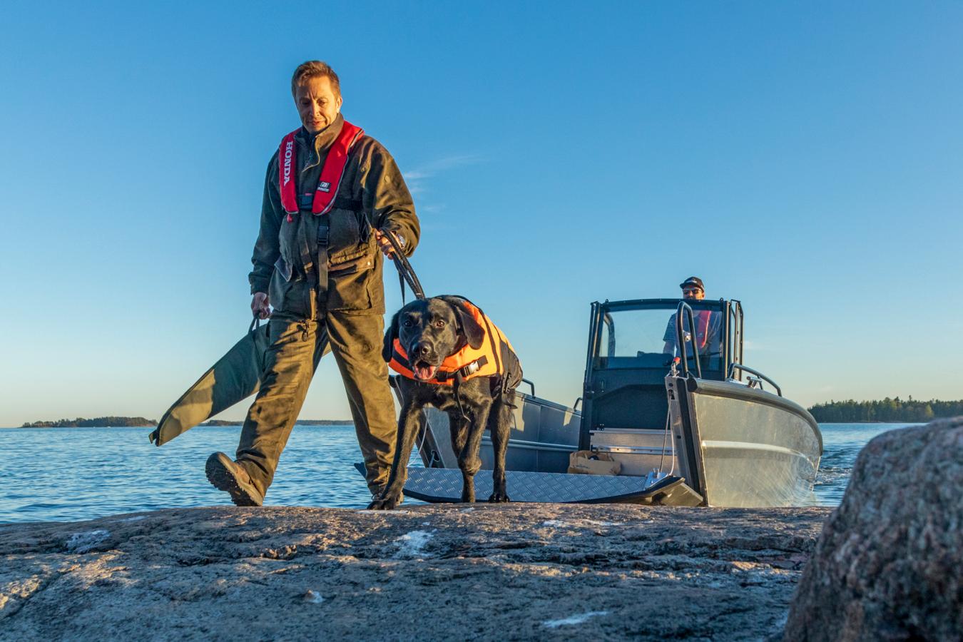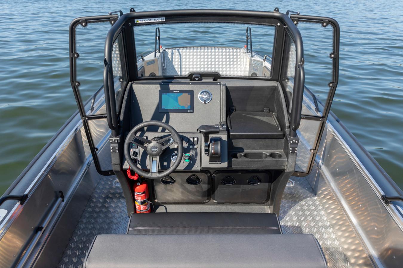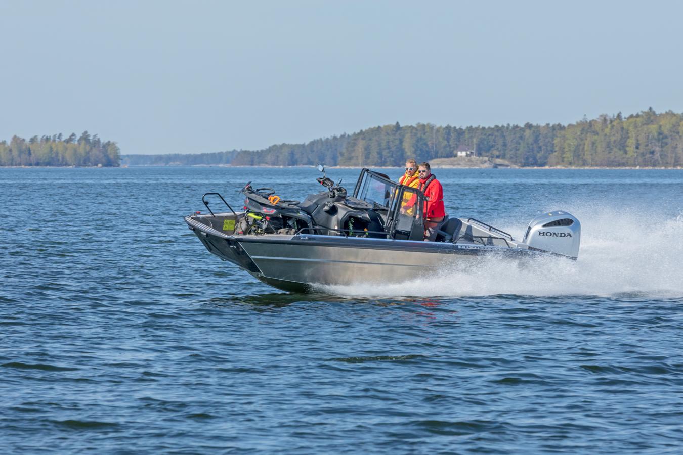 The whole construction of the boat, the practical bow ramp and the spacious bow area create a variety of different usage purposes for the boat: The easy-attainable deck space is optimal for transporting sizeable loads, for fishing or even for transporting diving equipment – with the bow ramp opened, divers can easily slide into the water from the bow. The 1,27 m wide practical bow ramp facilitates loading and embarkation, and even enables easy transportation of an ATV.