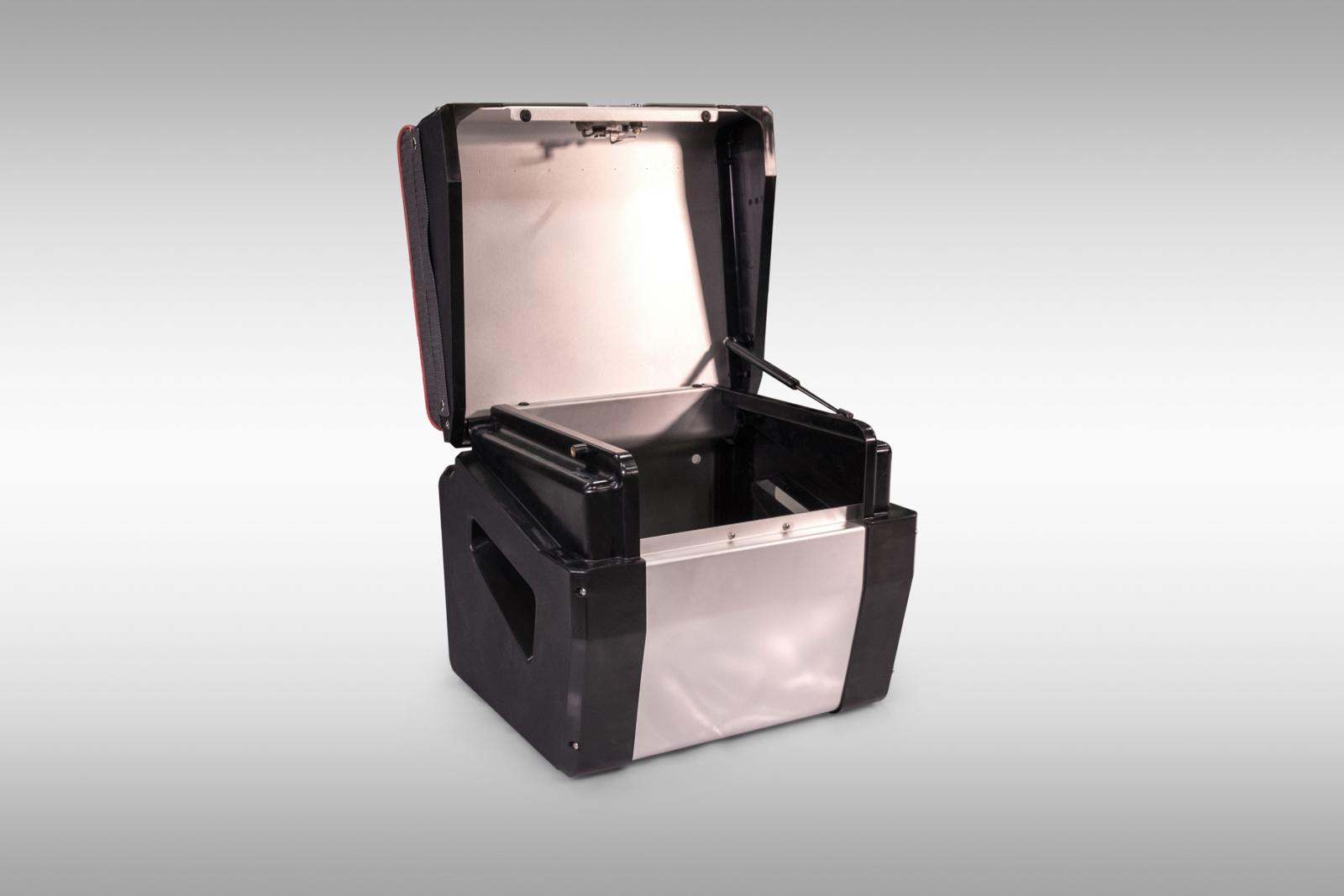 Sittbox utrustad med gasfjäder och ett integrerat Abloy-lås som standard. Sidväggarna är av aluminium och ändorna av hårdplast. Båda ändorna har ergonomiska bärhandtag som samtidigt fungerar som ventilationsöppningar för boxen. Försedd med ett integrerat rostfritt låsreglage (RST) som är bekvämt att använda och eliminerar risken för att slå i benet då man rör sig i båten. Den mjuka Smart Deck -ytan på boxens lock ökar komforten, isolerar mot kyla/värme och är lätt att torka av efter regn. Sittdynan säljs separat (äldre modellens sittdynor passar tyvärr inte till denna box). Sittboxen fästs som vanligt i tillbehörsskenan av aluminium som löper längs inre skrovsidorna/styrkonsolen, vilket gör den kompatibel även med äldre båtmodeller som inte längre är i produktion. OBS! Den 50 cm breda sittboxen ryms inte framför pulpeterna på modellerna 525/545/570 SC – för detta ändamål ska den 40 cm breda sittboxen väljas. Bredd: 50 cm Höjd: 42 cm Djup: 46 cm